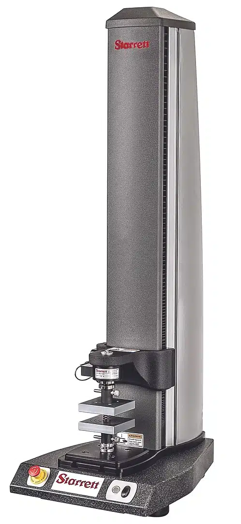 Starrett FMS and MMS Series test frames offer a compact solution for testing mechanical properties of components in a single column system. While both frames share a high-stiffness, granite-base chassis, they are tailored to specific analytical needs. The FMS (Force Measurement System) is optimized for load and distance analysis, while the MMS (Material Measurement System) provides the advanced strain-measurement capabilities required for determining Young’s Modulus and stress-strain curves.