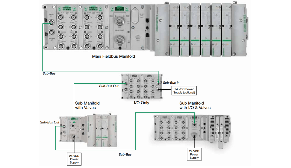 Wiring time can also be reduced by strategically placing valve, I/O, and combination manifolds around the machine using low-cost ‘sub-bus’ modules. These modules extend the fieldbus network around the machine, allowing a variety of network topologies at a fraction of the cost of a fieldbus node. These distribution options are illustrated below in Figure 6.